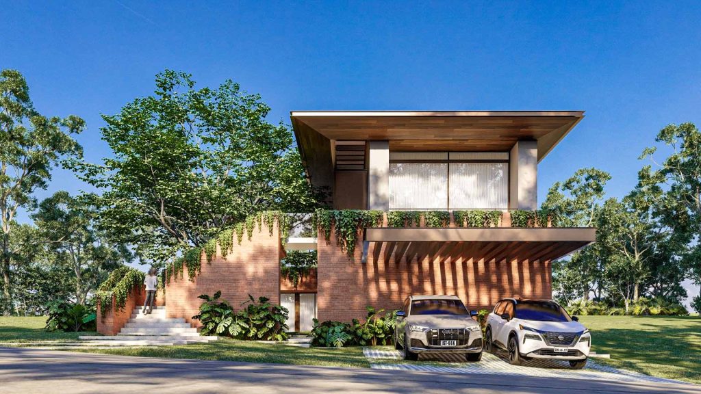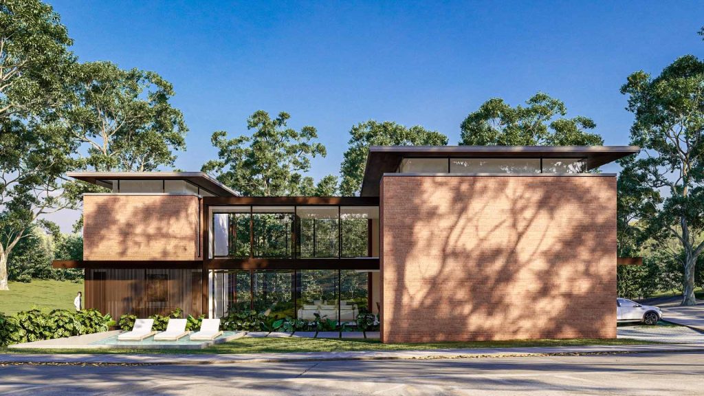La Casa Guayacán es una residencia unifamiliar de lenguaje contemporáneo que se distingue por la fuerza de su composición volumétrica y su íntima relación con el entorno natural. El proyecto se organiza en dos volúmenes pesados de ladrillo visto, sólidos y sobrios, que se conectan a través de un volumen ligero de vidrio, generando una […]