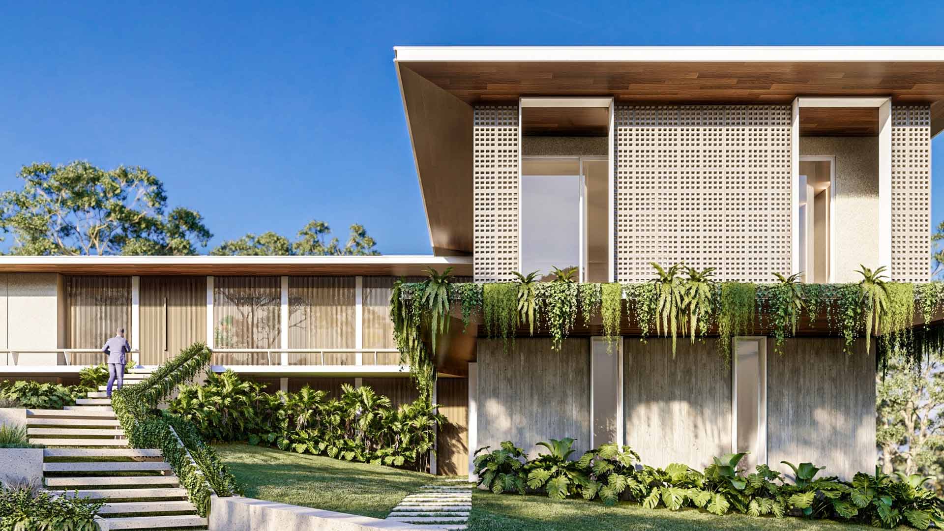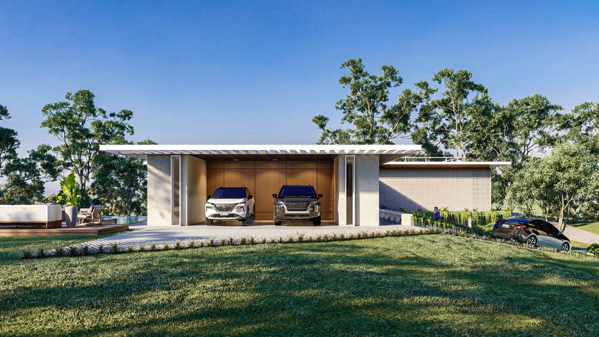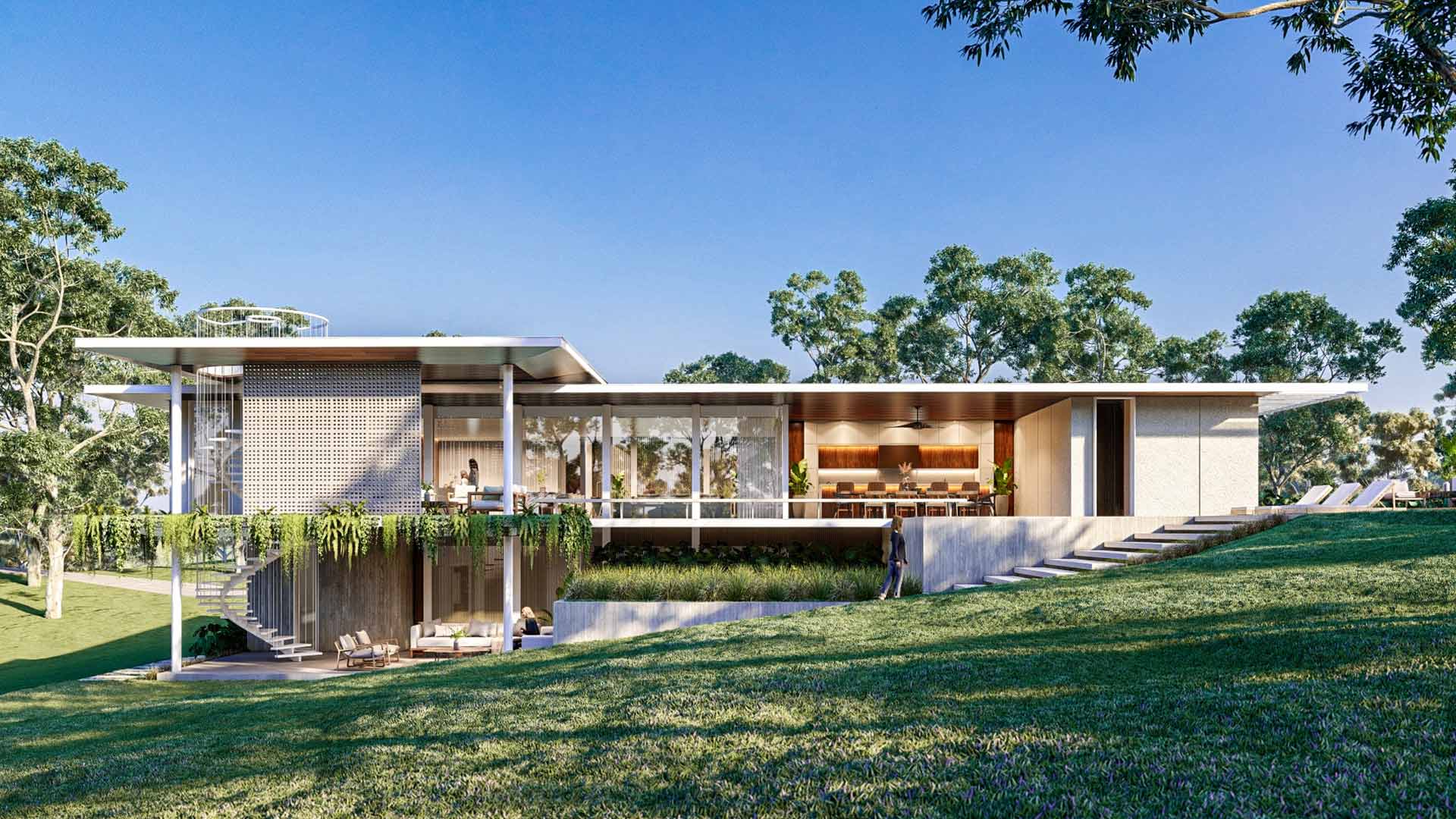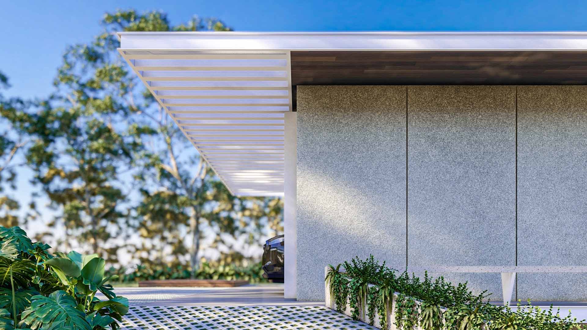 La materialidad apuesta por la paleta blanca y neutra, símbolo de la renovación familiar en su traslado a Santa Cruz, en contraste con la calidez de la madera y el verde intenso de la vegetación circundante. El resultado es un conjunto luminoso, elegante y armónico, que refleja la idea de un nuevo Aurora a través de la arquitectura.