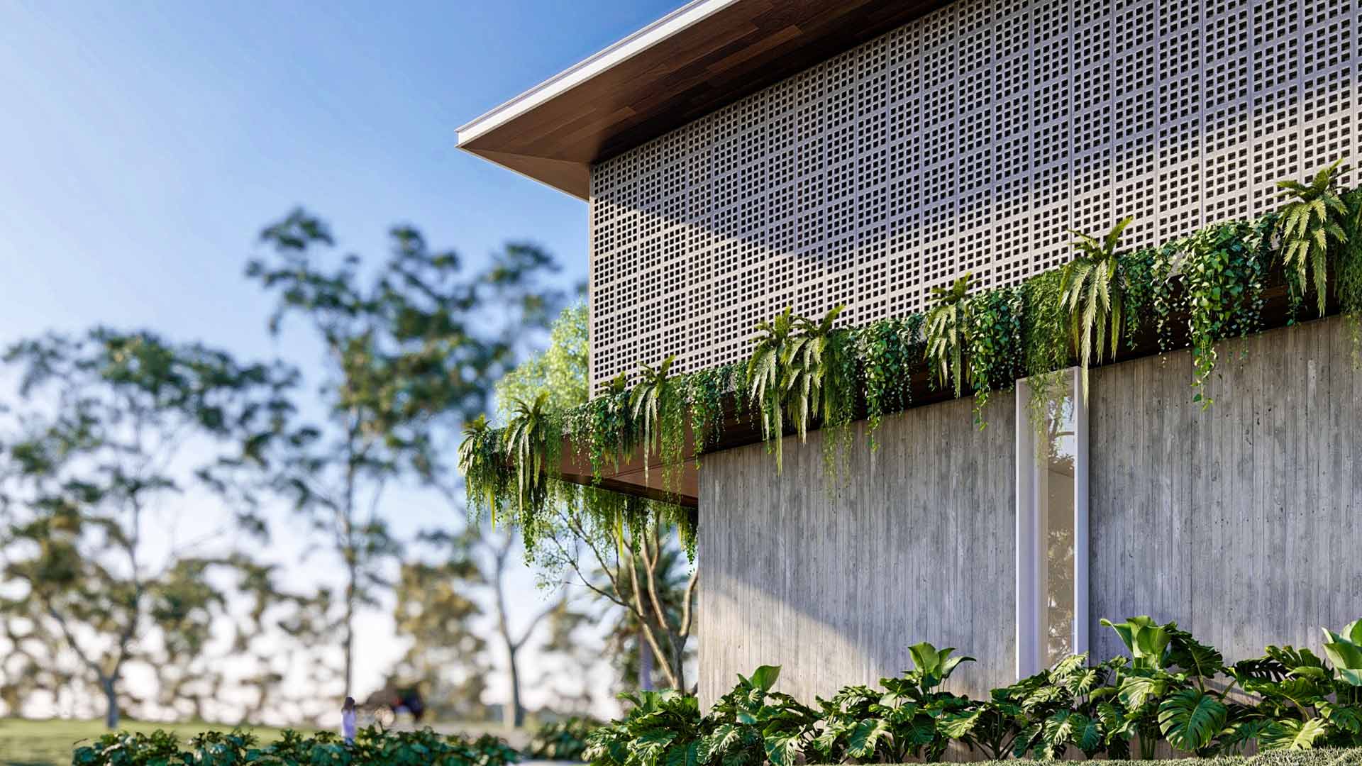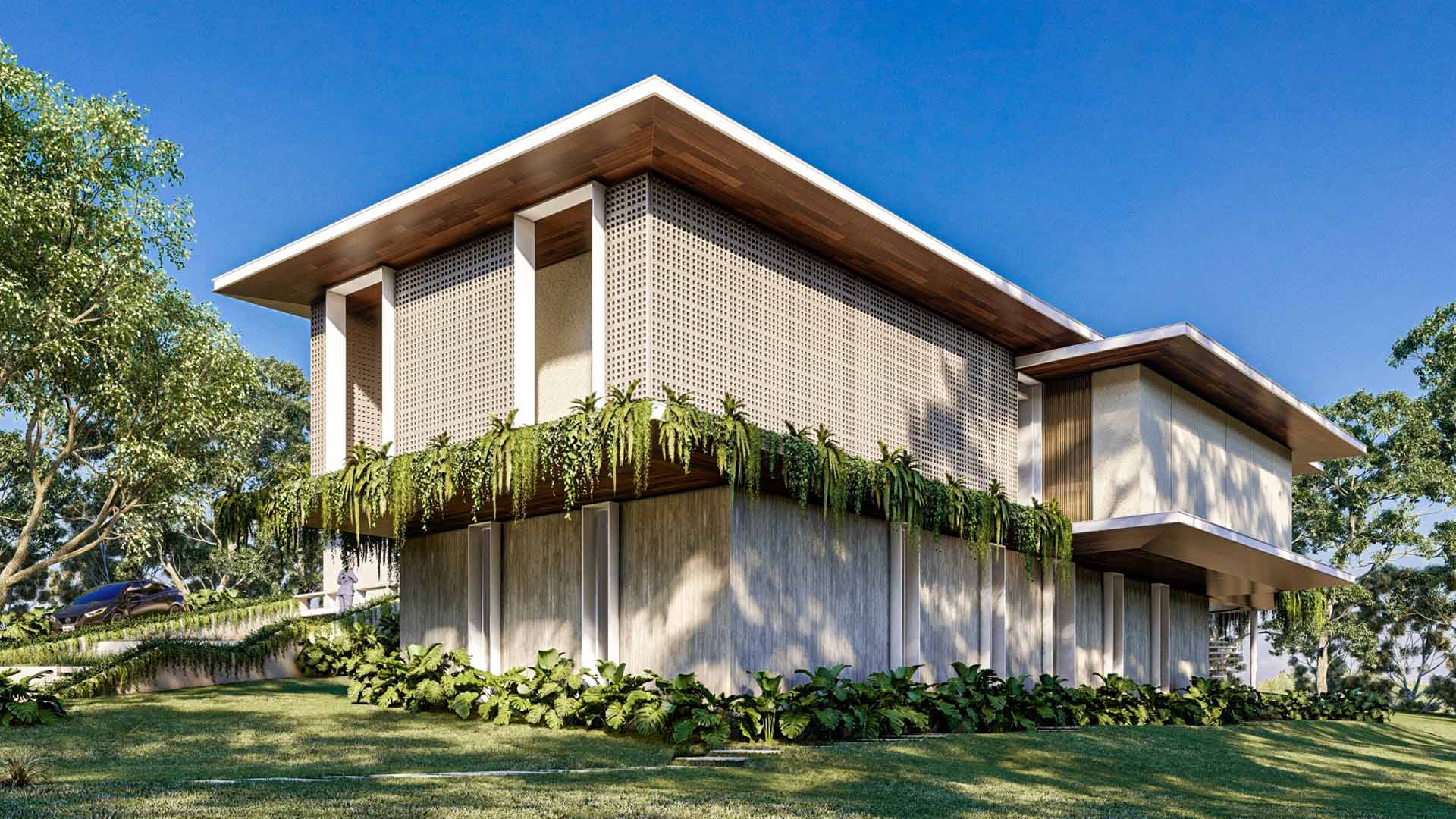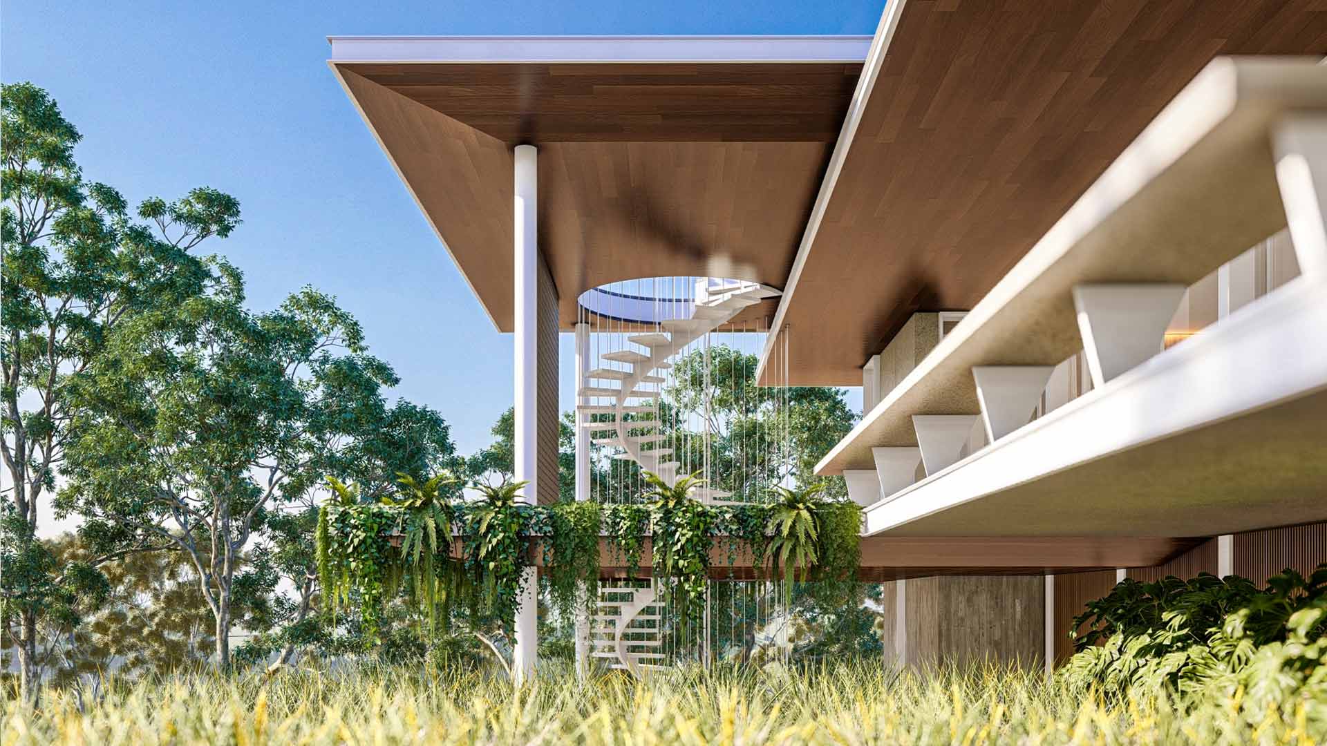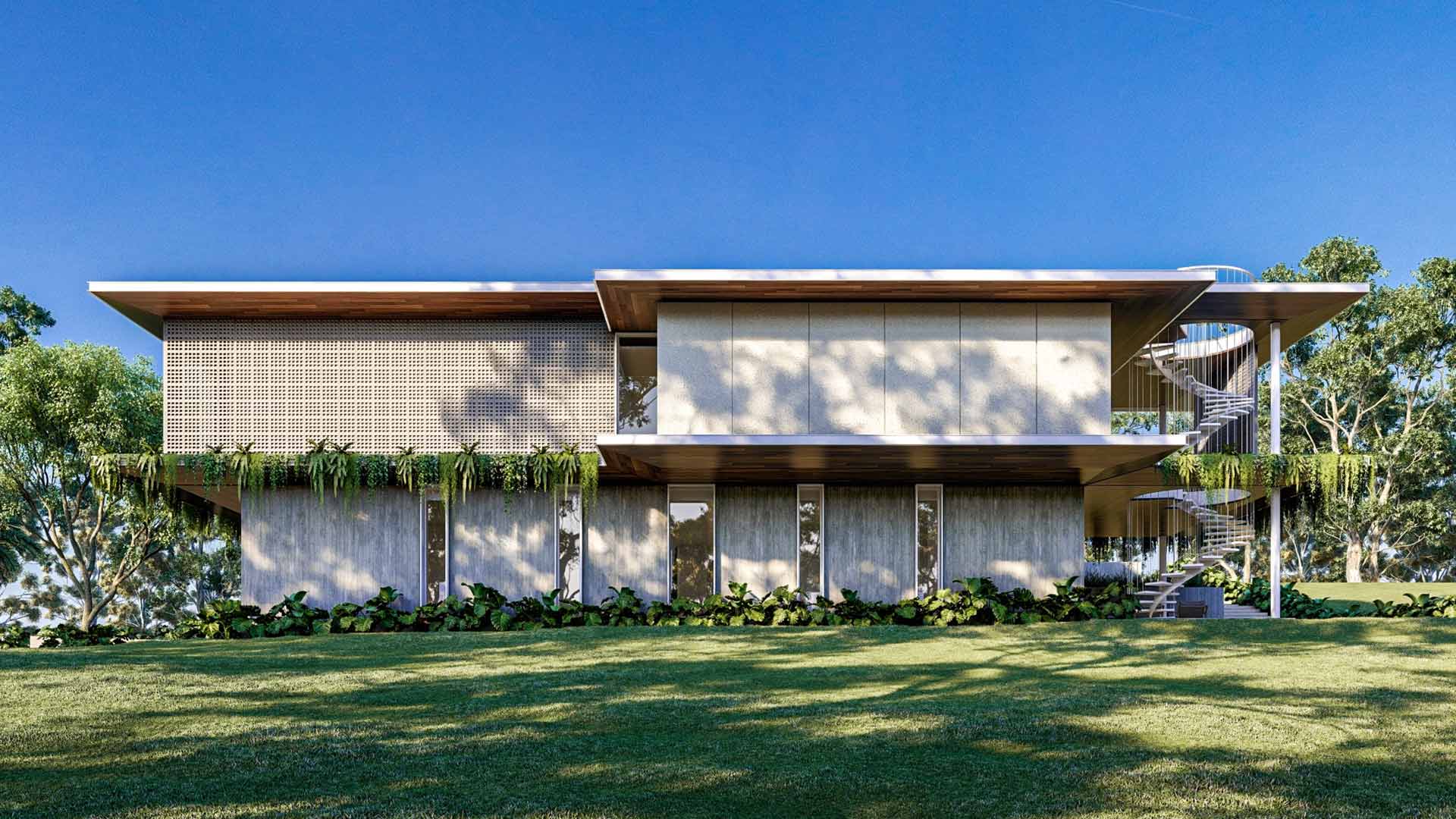 La materialidad apuesta por la paleta blanca y neutra, símbolo de la renovación familiar en su traslado a Santa Cruz, en contraste con la calidez de la madera y el verde intenso de la vegetación circundante. El resultado es un conjunto luminoso, elegante y armónico, que refleja la idea de un nuevo Aurora a través de la arquitectura.