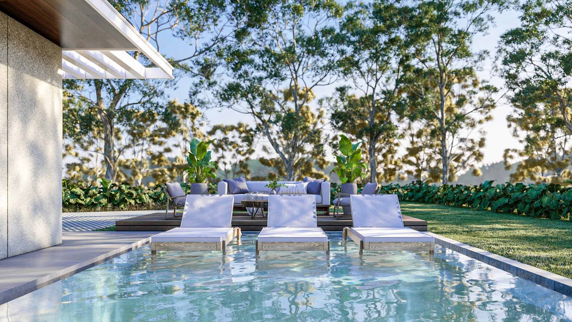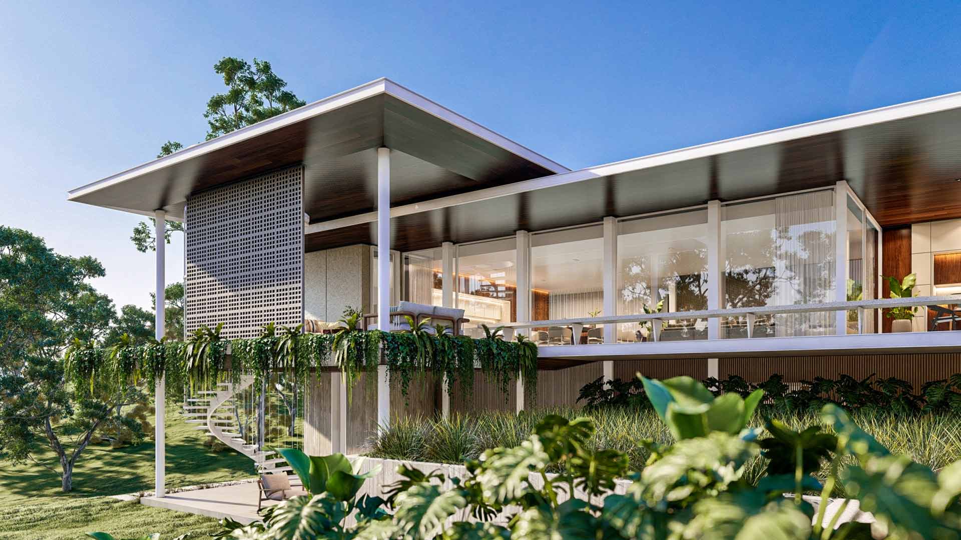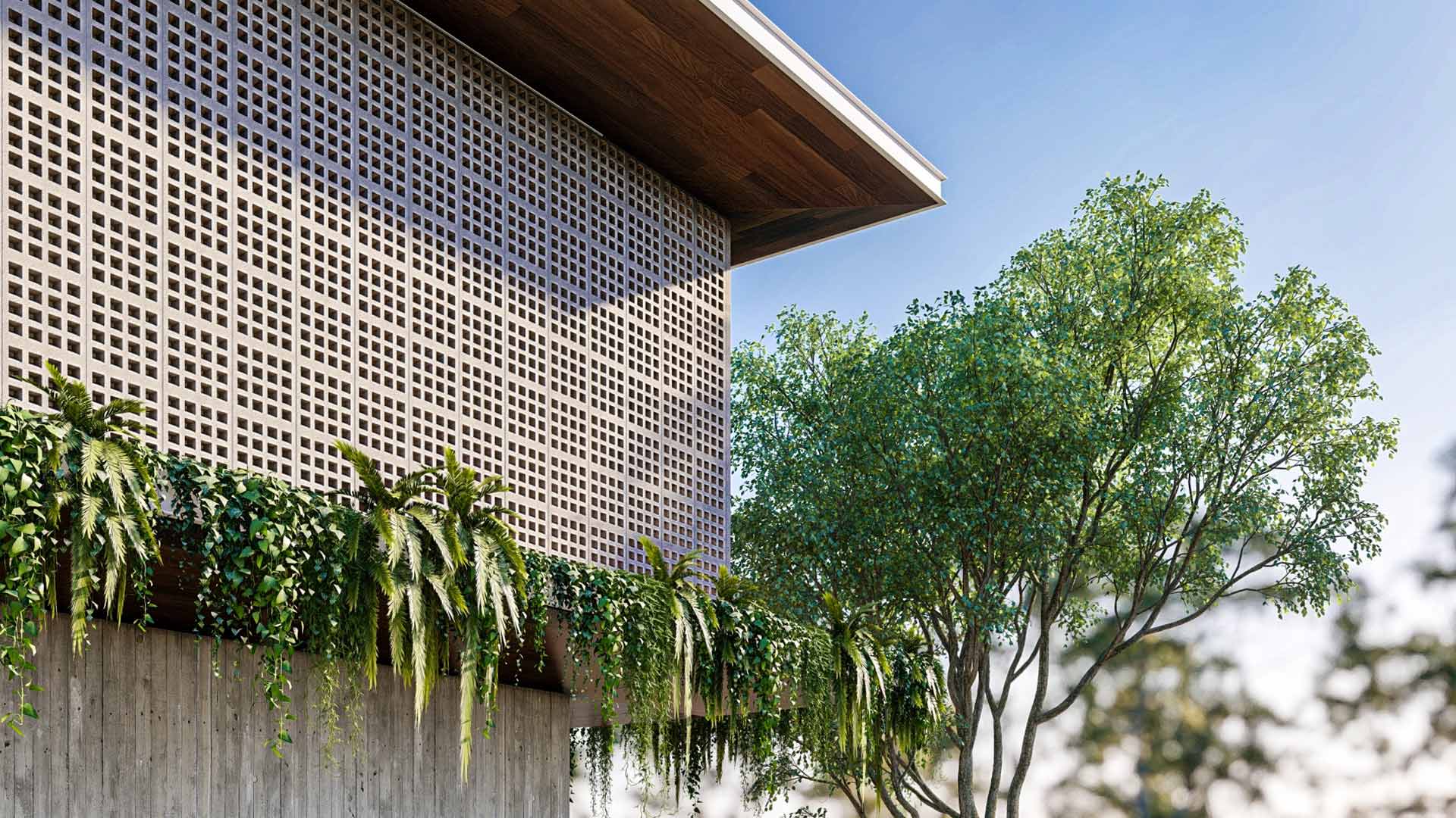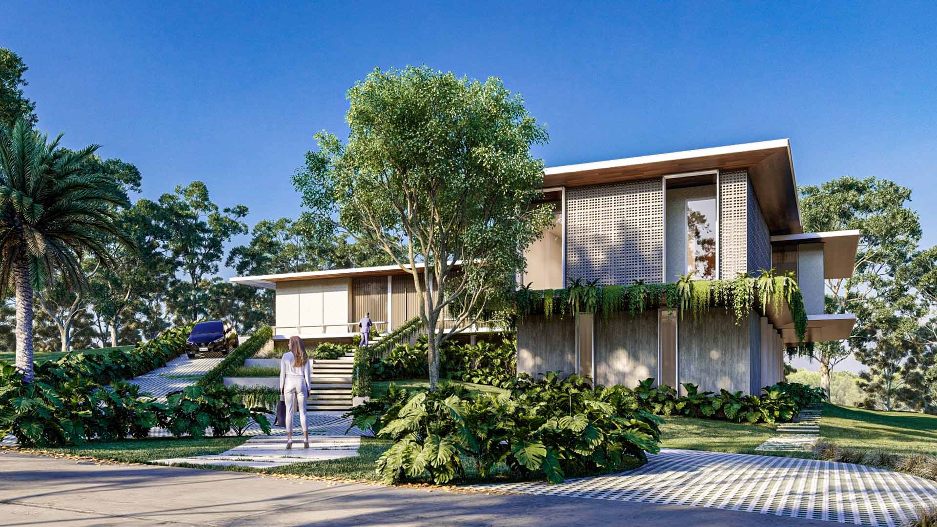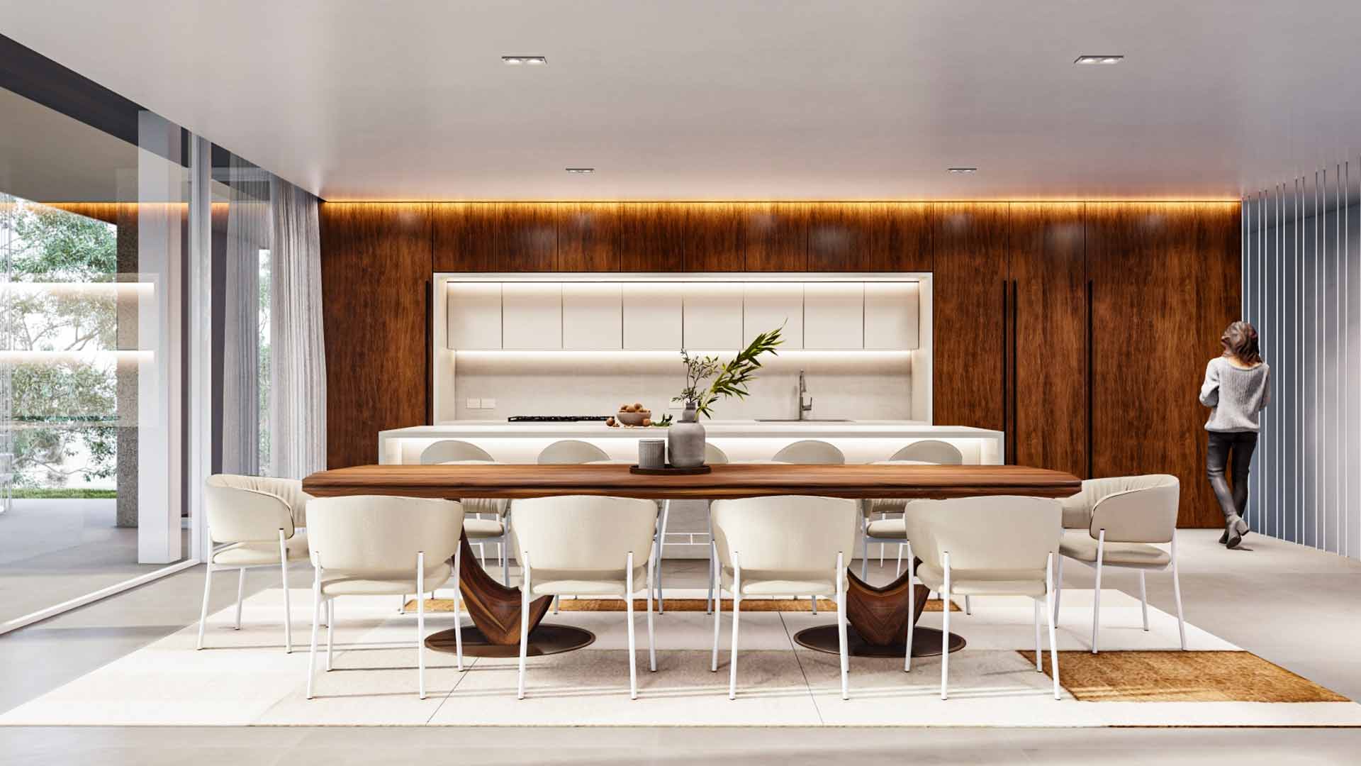 La materialidad apuesta por la paleta blanca y neutra, símbolo de la renovación familiar en su traslado a Santa Cruz, en contraste con la calidez de la madera y el verde intenso de la vegetación circundante. El resultado es un conjunto luminoso, elegante y armónico, que refleja la idea de un nuevo Aurora a través de la arquitectura.