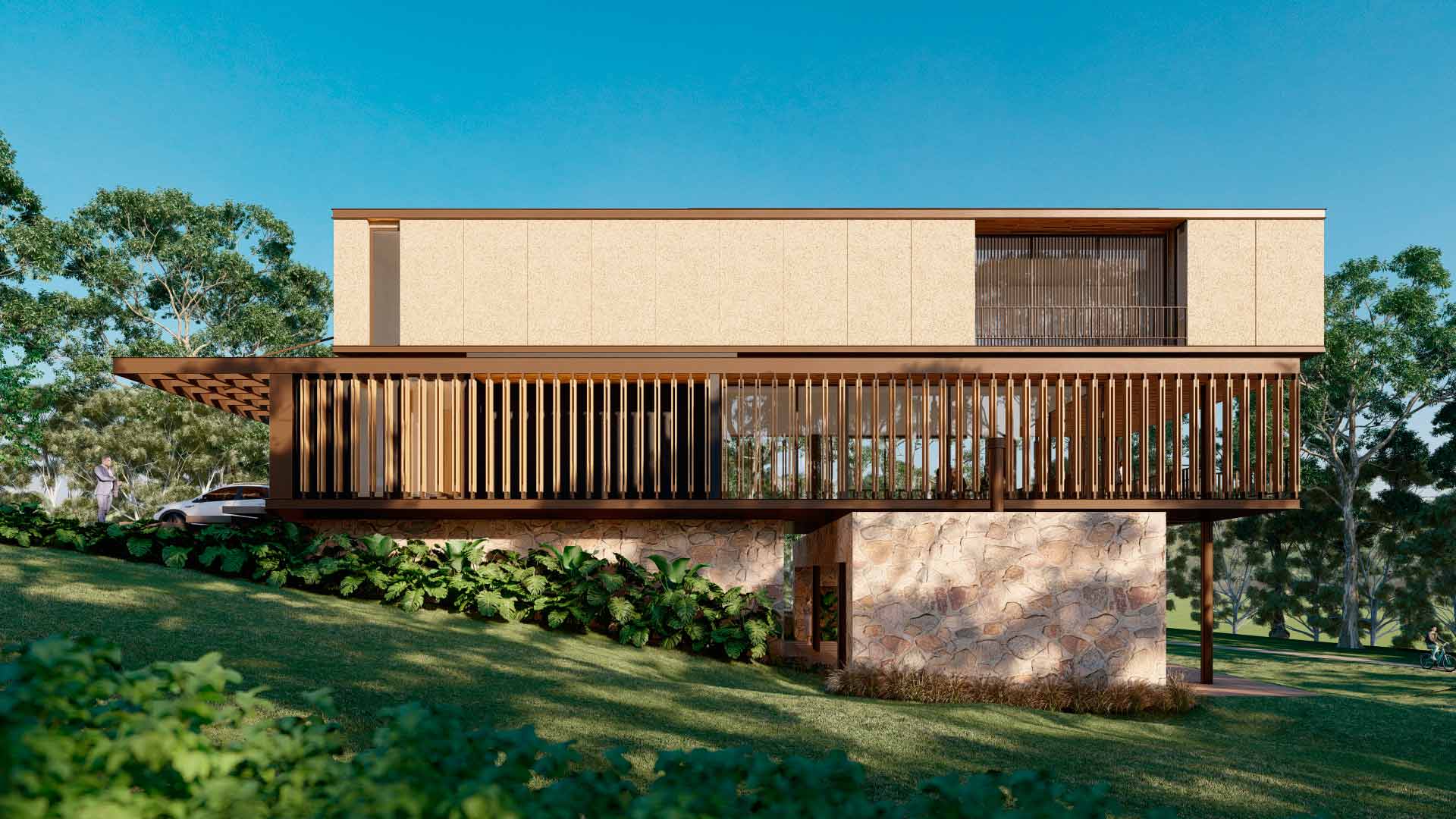 El diseño se articula en tres volúmenes claramente diferenciados y desplazados. El basamento de piedra alberga el área social y enmarca la piscina, creando un espacio protegido que conecta la vida interior con el área verde exterior. Sobre este nivel se eleva un volumen ligero de vidrio, envuelto por una piel de persianas que regula la luz y la temperatura, generando transparencia y frescura sin sacrificar confort. Finalmente, el volumen superior más cerrado, destinado a los dormitorios, se proyecta como una pieza sólida y profunda, con terrazas empotradas que refuerzan la privacidad y la volumetría del conjunto.